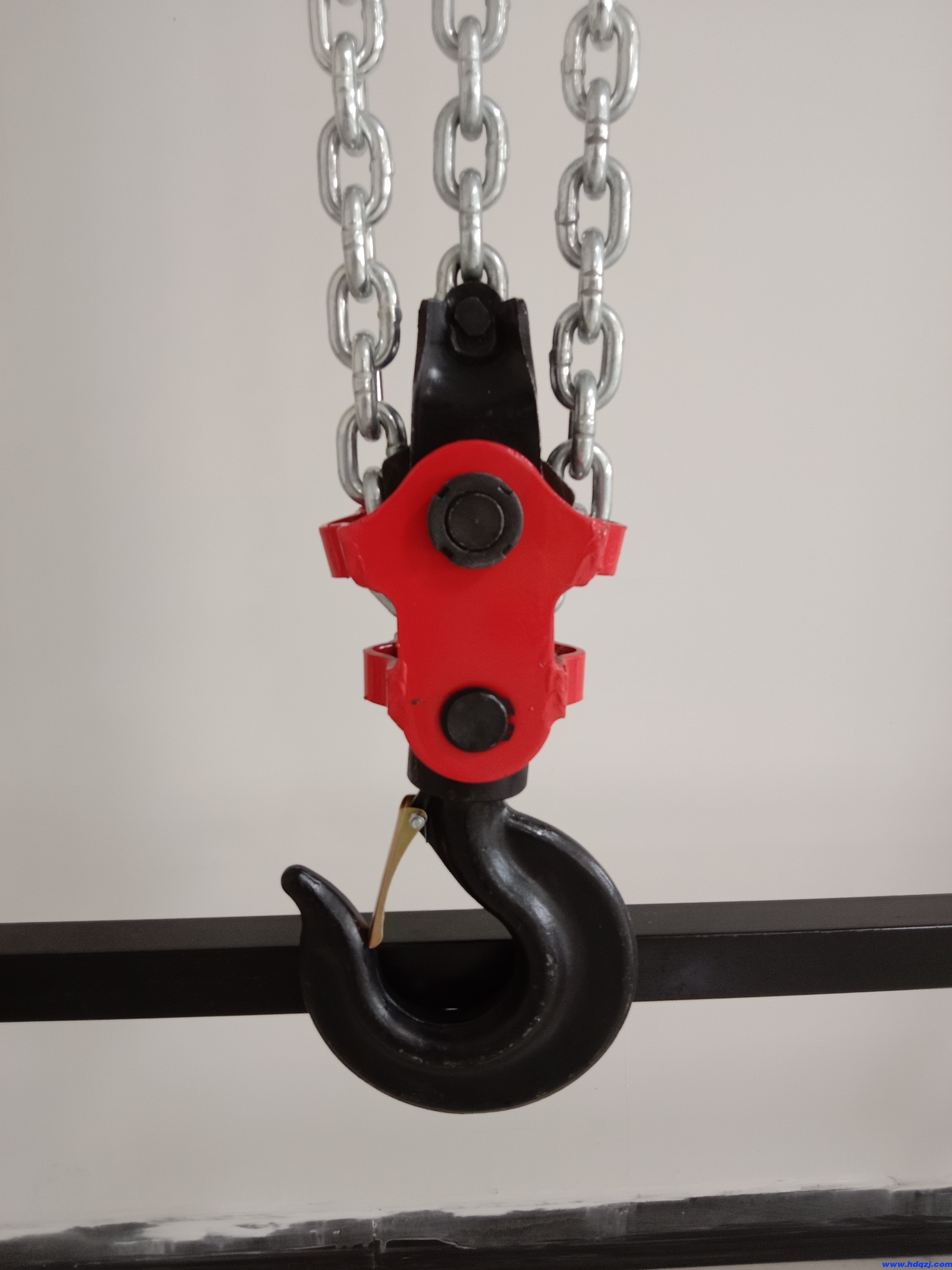 3、使用前,使下吊鉤處于自然下垂狀態,并將起重鏈條與下吊鉤相連的鏈條拉緊,檢查起重鏈條是否理順,嚴禁鏈條打結、翻鏈。