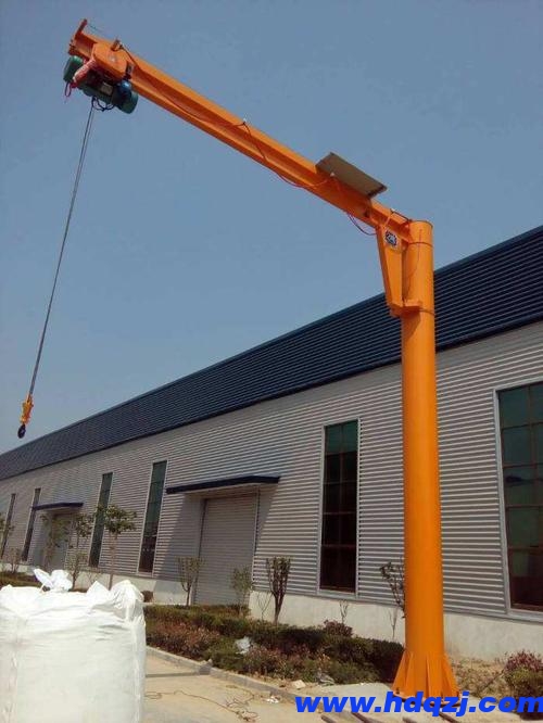 旋臂起重機是與環鏈電動葫蘆或CD、MD型電動葫蘆配套使用的一種起重機械。它由立柱、回轉臂、旋臂驅動裝置和電動葫蘆組成。立柱下端底座通過地腳螺栓固定的混凝土基礎上,由電機帶動減速機驅動裝置使懸臂回轉,電動葫蘆在懸臂工字鋼上作往返運行作業。