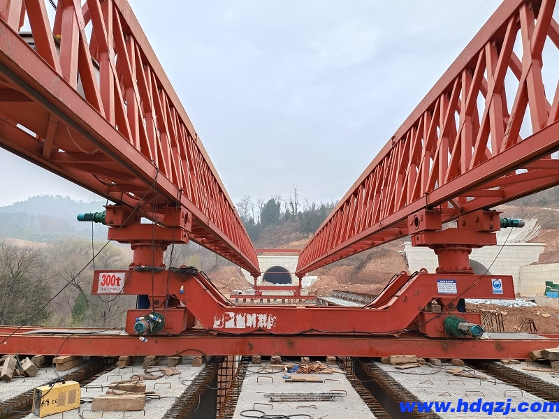 2. 架橋機對中完成后,仔細檢查對中情況,檢查前支腿是否挺直,橫向?qū)Я旱聂~尾板、扣鐵、車輪擋塊是否牢固。在確認其可靠性后,就可以進行架梁操作。
